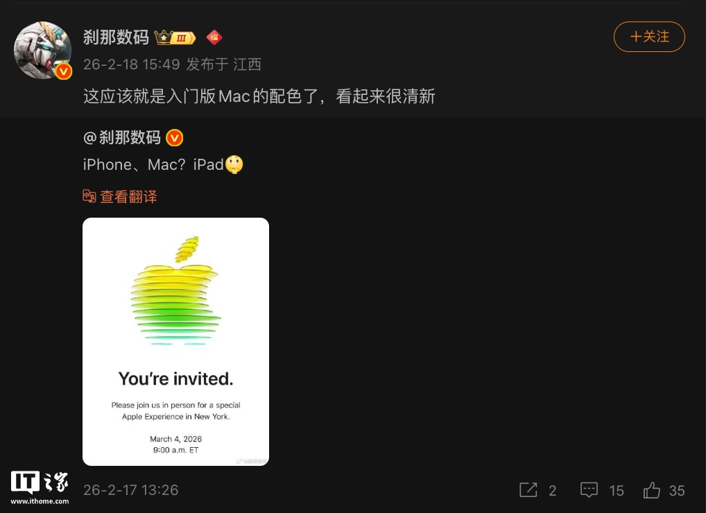 IT之家 2 月 18 日消息,博主 @刹那数码 援引苹果 3 月 4 日发布会邀请函,透露苹果届时将推出传闻已久的平价版 MacBook十大配资公司,邀请函中苹果 Logo 正是“入门版 Mac 的配色”。