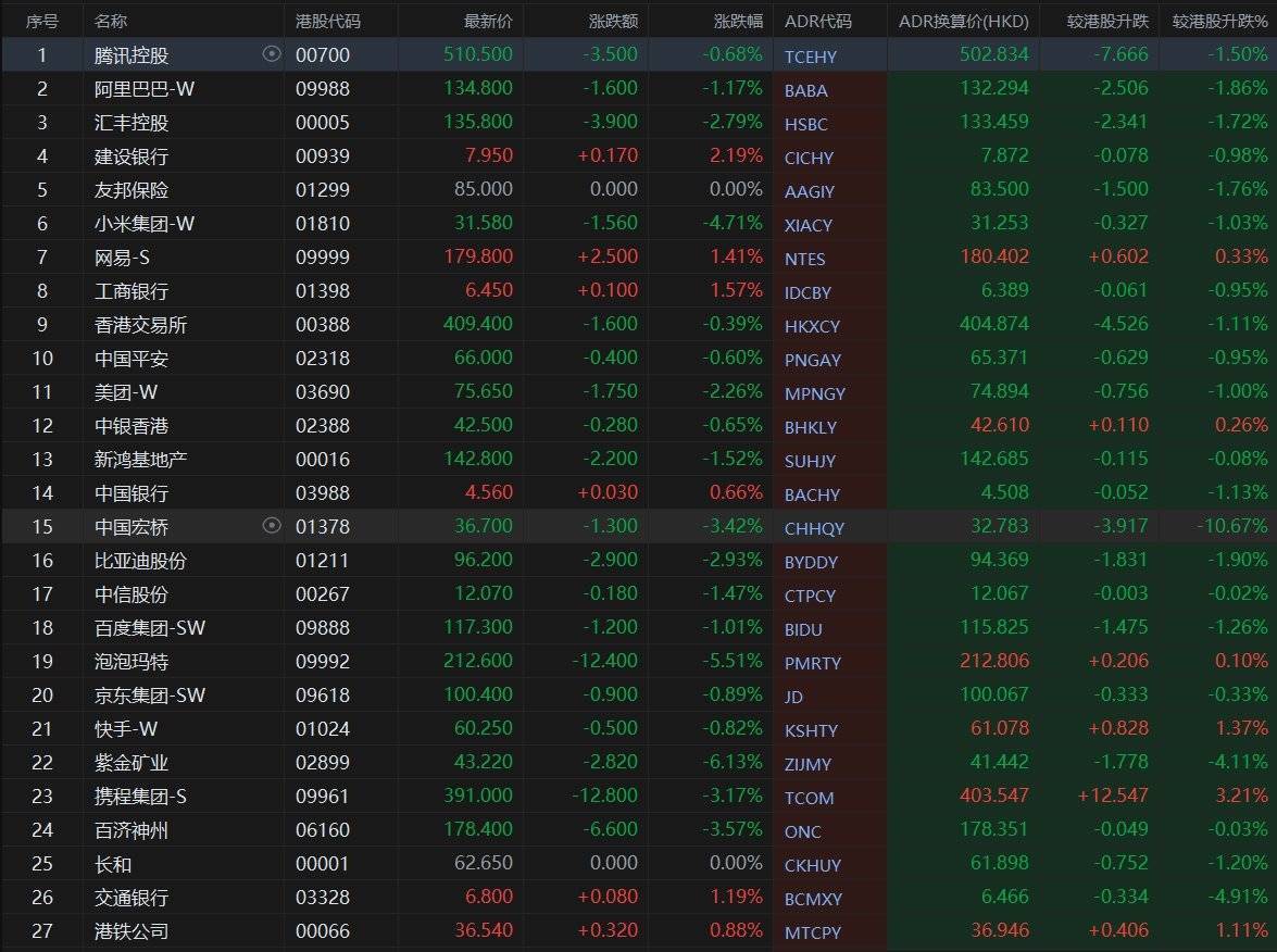 大型蓝筹股多数下跌股票配资一览表最新,汇丰控股收报133.459港元,较香港收市跌1.72%;腾讯控股收报502.834港元,较香港收市跌1.5%。
