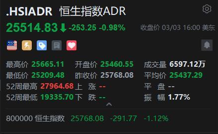 智通财经APP获悉,周二,美股三大指数集体下跌。恒生指数ADR下跌,按比例计算,收报25514.83点,较香港收市跌253.25点或0.98%。
